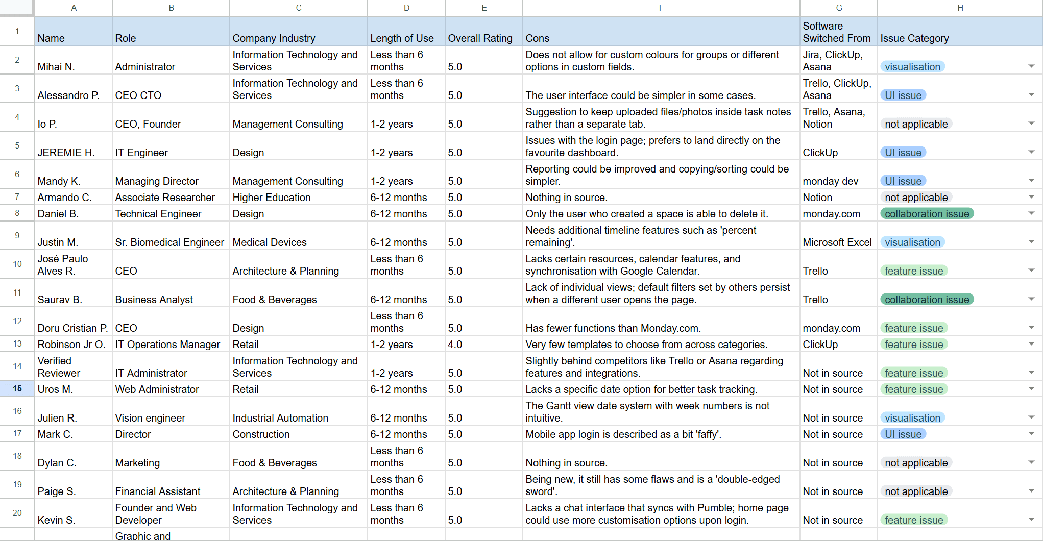 This dataset reviews a Plaky's user feedback and simple analysis. It groups issues into categories to show common problems, especially to identify specific areas for improvement, while also including some positive feedback.